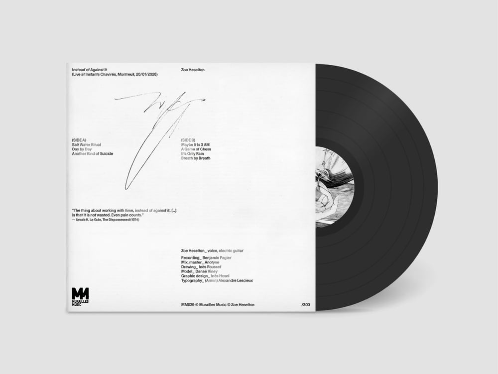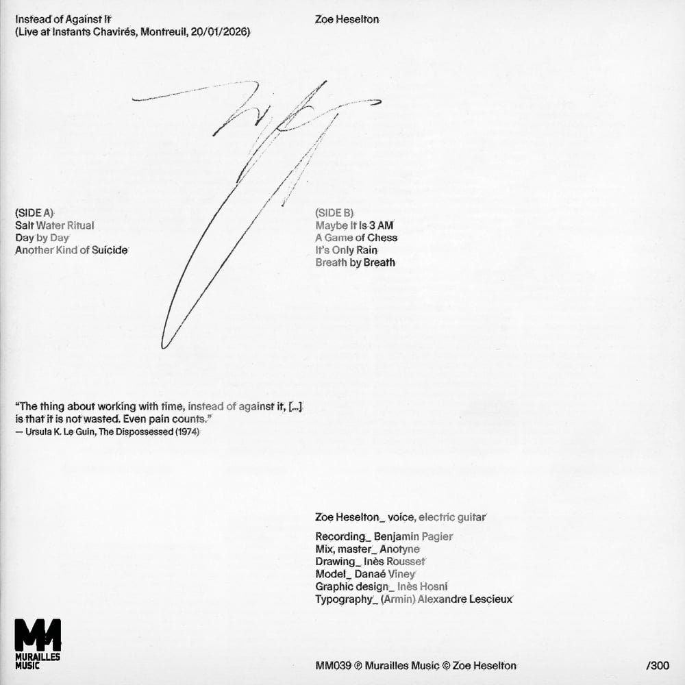EN | As a mirror to her 2025 studio album ‘Another Kind of Suicide’, ‘Instead Of Against It’ is the new live album by Zoe Heselton, recorded in January 2026 at Instants Chavirés, Montreuil. It contains the same songs that can be heard on Another Kind of Suicide, recorded then with six other musicians, but presented here in a more urgent and primitive form, delivered by the electric guitar and the voice alone.